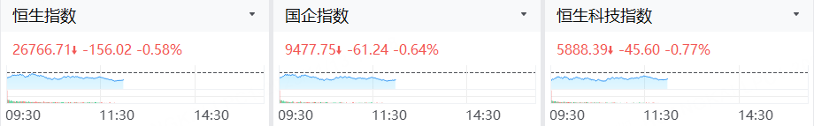 11月13日,港股三大指数齐跌,截止午间收盘,恒生指数跌0.58%,恒生科技指数跌0.77%,国企指数跌0.64%。