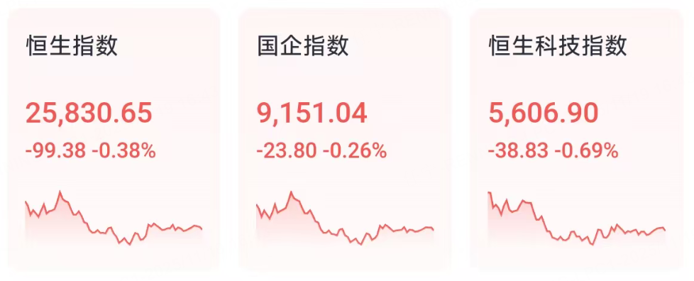 11月19日周三,港股今早冲高未果,三大指数午后集体走低。截至收盘,恒生指数跌0.38%,报25830.65点;恒生国企指数跌0.26%,报9151.04点;恒生科技指数跌0.69%,报5606.9点。