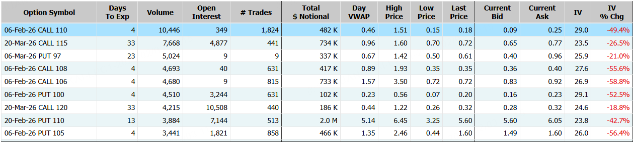 迪士尼隔夜跌超7%,期权合约成交19.6万张,较90日均量放大3.8倍。2月6日到期的110美元的行权看涨期权交易量特别高,共有10,446份合约交易。 $DIS 20260206 110.0 CALL$