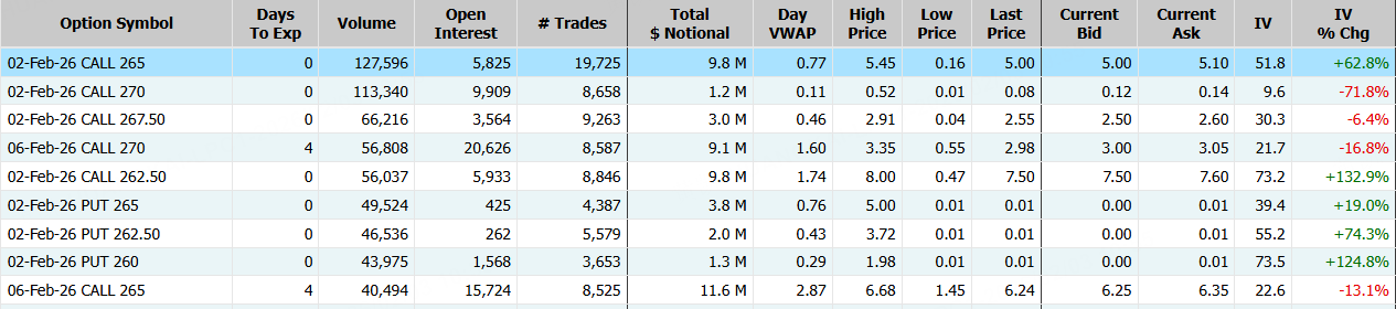 苹果隔夜涨超4%,期权合约成交169.02万张,当日(2月2日)到期的265美元的行权看涨期权交易量特别高,共有127,596份合约交易。