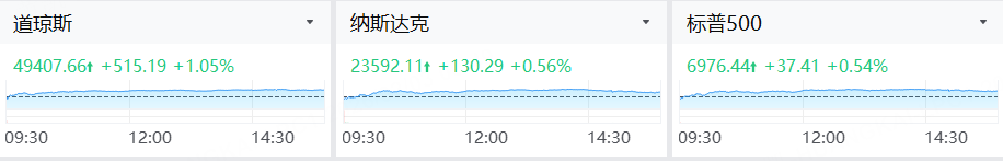 周一(2月2日), 美股三大指数集体收涨。截至收盘,标普500指数涨0.54%,纳斯达克综合指数涨0.56%,道琼斯工业平均指数涨1.05%。