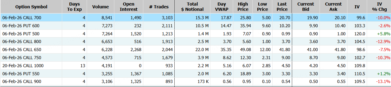 隔夜,美股存储概念股全线上扬,闪迪涨超15%。期权合约成交23.66万张,较90日均量放大3.7倍。2月6日到期的700美元的行权看涨期权交易量特别高,共有8,541份合约交易。 $SNDK 20260206 700.0 CALL$