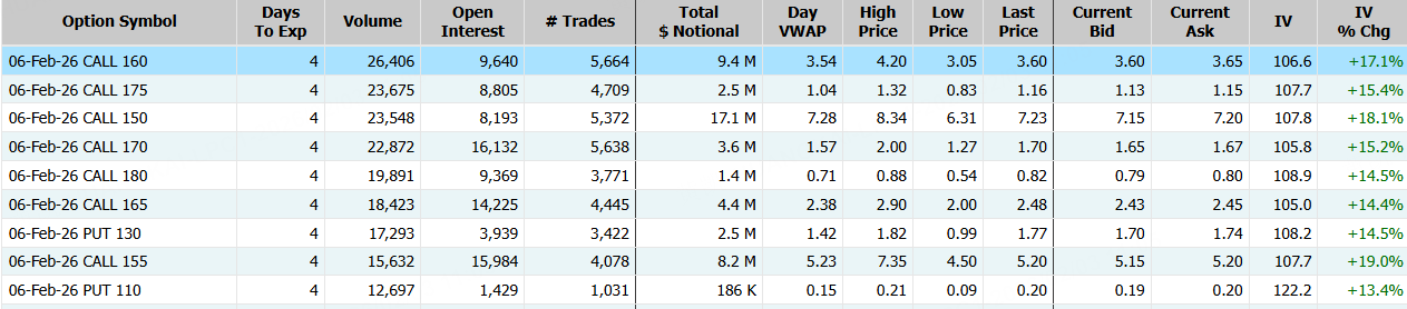 Palantir隔夜涨近1%,盘后续涨近7%。期权合约成交85.73万张,2月6日到期的160美元的行权看涨期权交易量特别高,共有26,406份合约交易。 $PLTR 20260206 160.0 CALL$