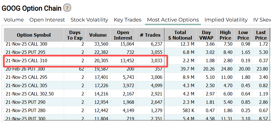谷歌排名成交量第三的合约是一张行权价达310美元的CALL,到期日是本周五。