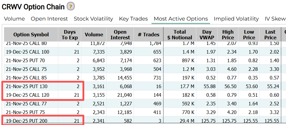 期权方面,CoreWeave的多张合约引人瞩目:一张12月19日到期的PUT,行权价高达200美元,卖出PUT的投资者看来对后市有独特判断。此外,本周五到期的一张PUT行权价130美元。12月19日到期的一张CALL行权价120美元。以上合约的行权价均较现价有较大空间。