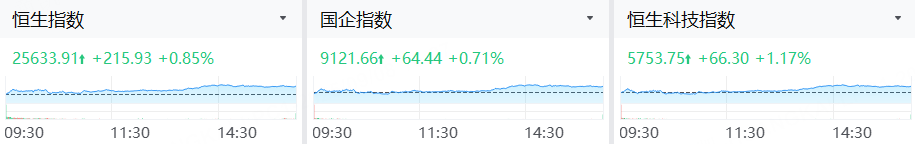 港股三大指数齐涨,恒生指数涨0.85%,恒生科技指数涨1.17%,国企指数涨0.71%。