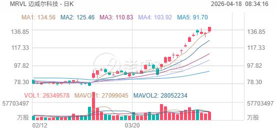 半导体股普涨。 迈威尔科技涨4.74%,月内已暴涨超41%。