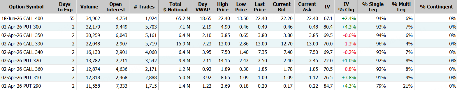 期权方面,美光科技当日成交75.8万张,较90日均量放大近2倍,看涨期权占比57.1%,其中于6月18日到期的400美元行使价的看涨期权成交居前,成交超3.5万张。