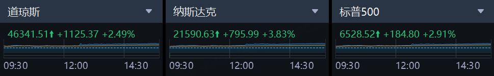 美东时间周二,美股三大指数大幅飙升,均创下去年5月以来最大单日涨幅。截至收盘,道指涨1125.19点,涨幅为2.49%,报46341.33点;纳指涨795.99点,涨幅为3.83%,报21590.63点;标普500指数涨184.80点,涨幅为2.91%,报6528.52点。