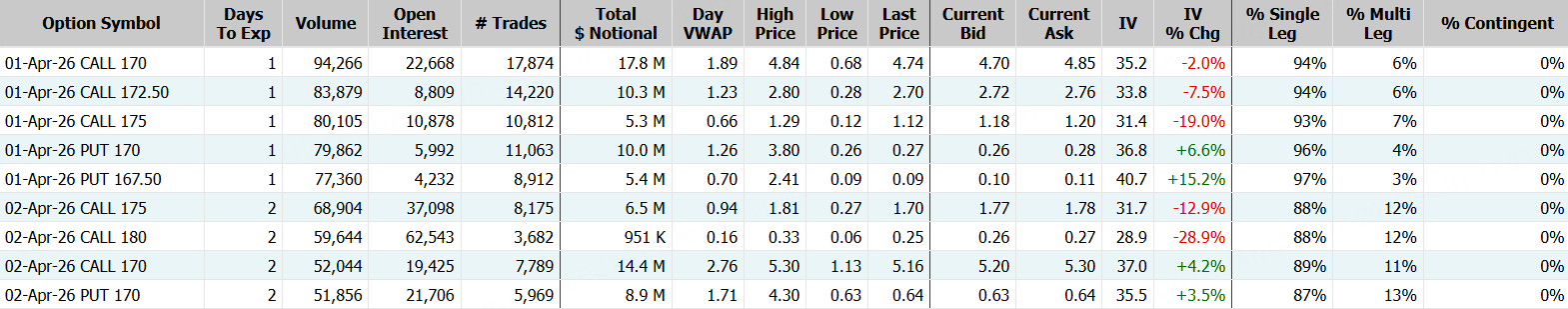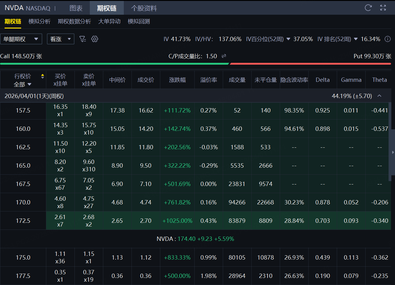 期权方面,英伟达当日成交247.79万张,看涨期权占比攀升至60%,其中于4月1日到期的170美元行使价的看涨期权成交居前,成交超9.4万张。此外,从期权链上看,英伟达多张Call单大涨,最高涨超1000%。