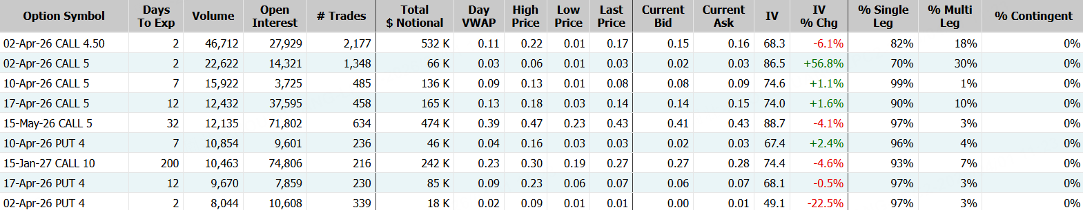 期权方面,Snap当日成交29.57万张,较90日均量放大近3倍,看涨期权占比80.9%,其中于4月2日到期的4.5美元行使价的看涨期权成交居前,成交超4.6万张。
