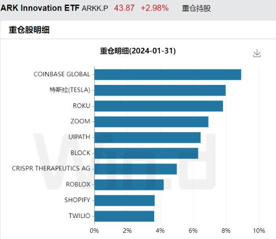 Wind 数据显示,截止到今年1月底,木头姐的旗舰基金ARK Innovation ETF 的最大持仓依旧是coinbase,特斯拉和Roku。前三大持仓股中,除了coinbase 年初至今表现优异大涨约36%,特斯拉和Roku都大幅回撤超过30%。尽管coinbase 今年涨幅巨大,但距离2021年历史高点仍下跌了约30%。