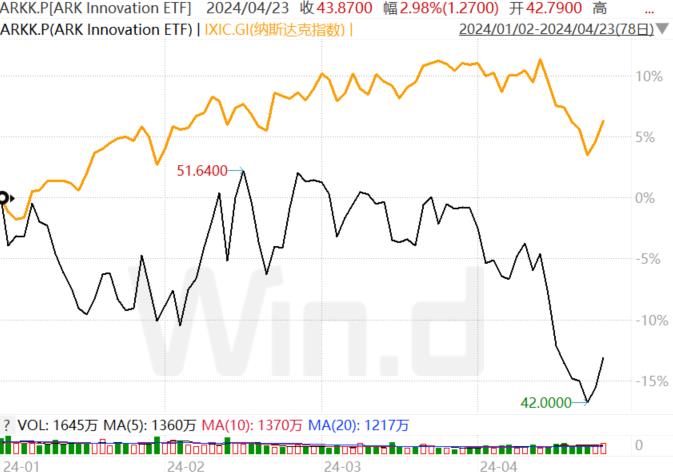 不过分析师一直强调,ARK 的投资风格风险很大,因为在接近零利率的时代,他们的投资策略是奏效的,但利率上升之后,这些押注就注定难以获得预期中的回报。2023年,ARK 系列基金的投资者损失了143亿美元。当年,ARK 的旗舰基金ARK Innovation ETF 在市场反弹之前卖掉了芯片股,错过了芯片股在AI加持下的史诗级大涨。