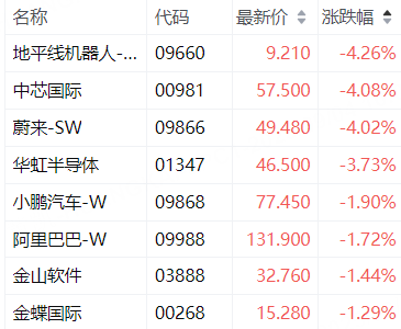 9月4日,恒指、科指盘初双双转跌;科指成分股中,中芯国际、蔚来-SW跌超4%,华虹半导体跌超3%,小鹏汽车-W、阿里巴巴跌近2%。