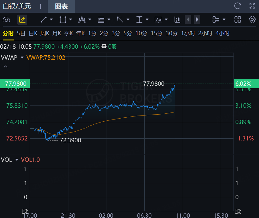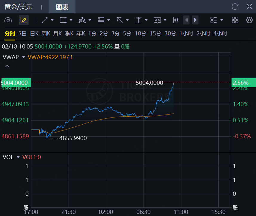 2月18日,国际贵金属价格持续走高,现货黄金再度站上5000美元/盎司,日内涨幅约2.5%;现货白银涨超6%,报77.98美元/盎司。