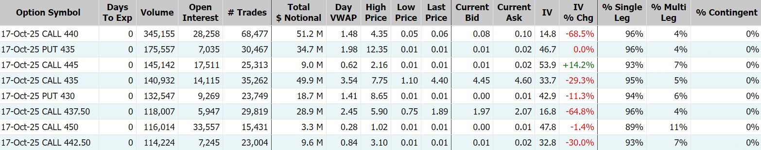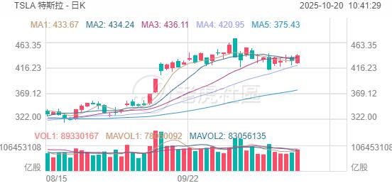期权方面,特斯拉当日期权成交344.06万张,环比前一交易日激增近60%,看涨期权占比55.5%,其中于10月17日到期的440美元行使价的看涨期权成交居前,成交近34.52万张。