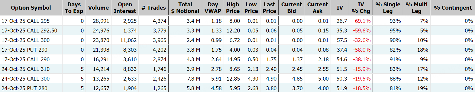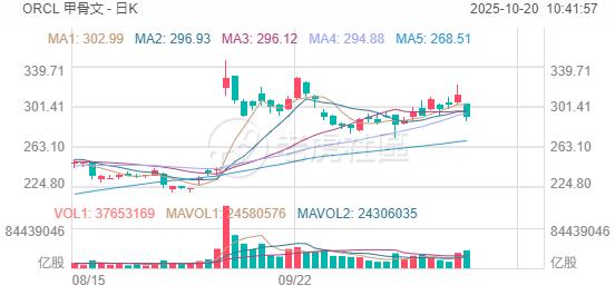 期权方面,甲骨文当日期权成交59.46万张,较90日均量放大逾2倍,看跌期权占比升至36.3%,其中于10月17日到期的295美元行使价的看涨期权成交居前,成交近2.9万张。