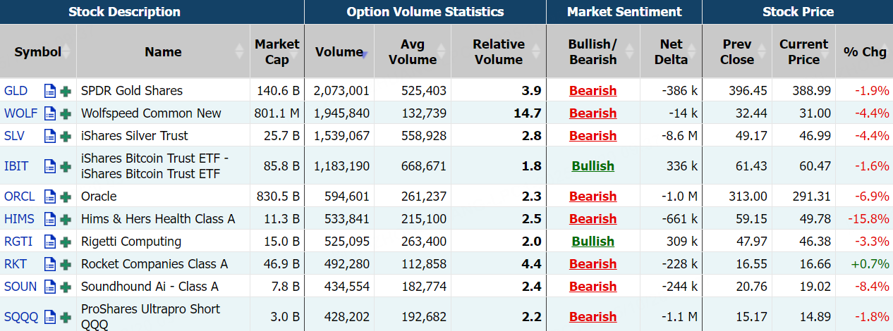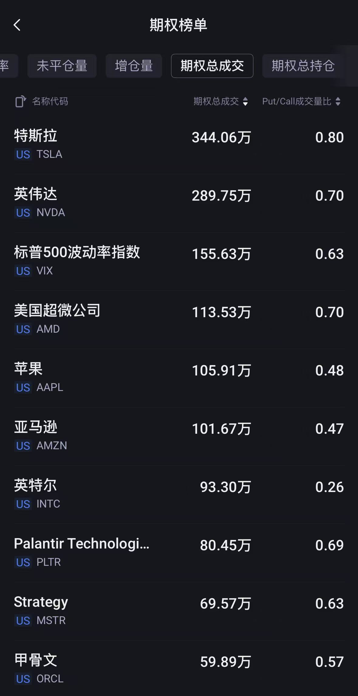 上周五,期权市场总成交量7414.65万张合约,高于90日均量;特斯拉当日期权成交344.06万张,环比前一交易日激增近60%,看涨期权占比55.5%;甲骨文当日期权成交59.46万张,看跌期权占比小幅攀升>>