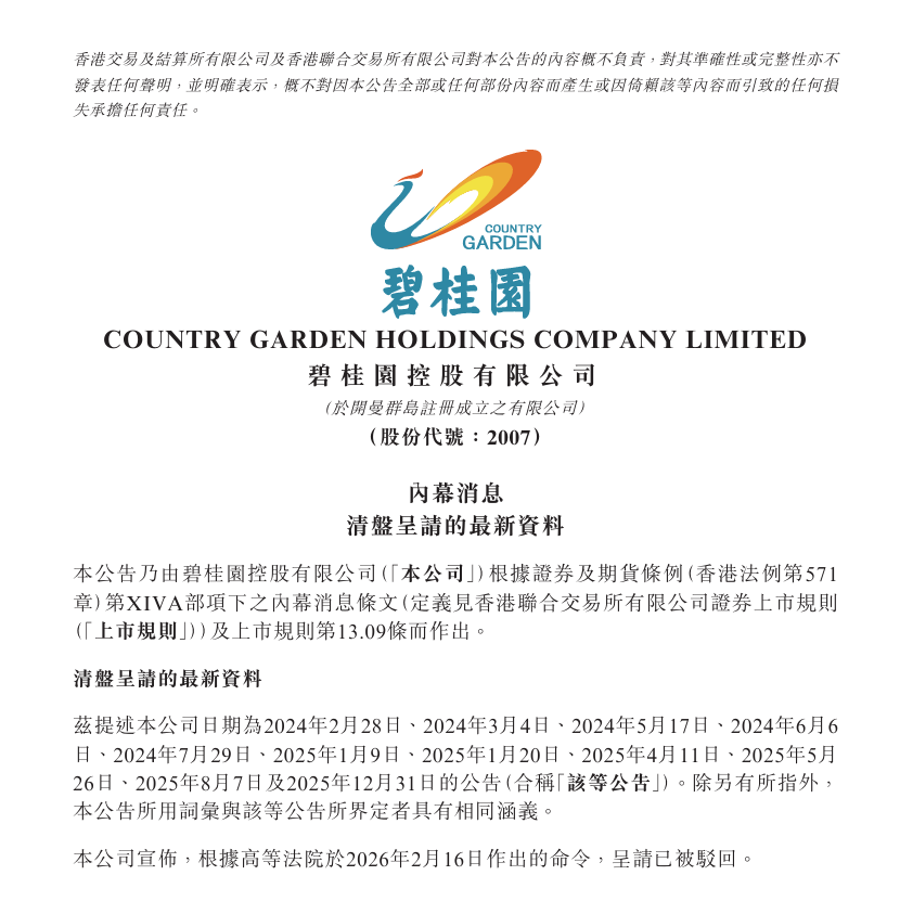2月16日,碧桂园在港交所公告称,高等法院驳回碧桂园清盘呈请。