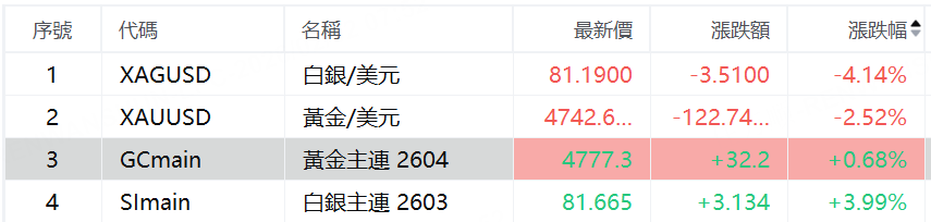 北京时间2月2日早间,现货黄金、白银跳水,现货白银盘初一度大跌超7%,现货黄金一度大跌近4%,截至发稿,跌幅分别为4.14%、2.52%,分别报4742美元/盎司,81.19美元/盎司。