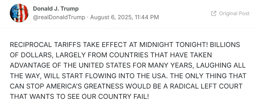 8月7日,美国总统特朗普在社交媒体最新发文:“对等关税将于今晚午夜(美东时间)生效!数十亿美元将开始流入美国,主要来自那些多年来一直占美国便宜的国家。