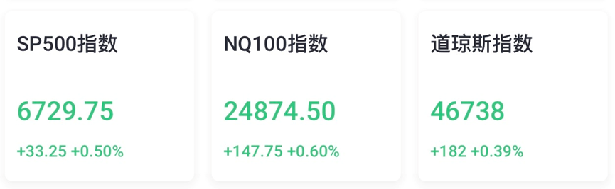 9月29日周一,美股三大股指期货在盘前时段持续上涨。纳指100指数期货涨0.60%,报24874.5点,标普500指数期货涨0.5%,报6729点,道琼斯指数期货涨0.39%,报46738点。