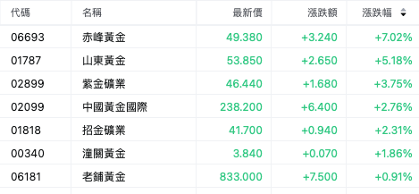 今日港股黄金股大幅走高,赤峰黄金涨超7%,山东黄金涨超5%,紫金矿业涨超3%,中国黄金国际、招金矿业涨2%。