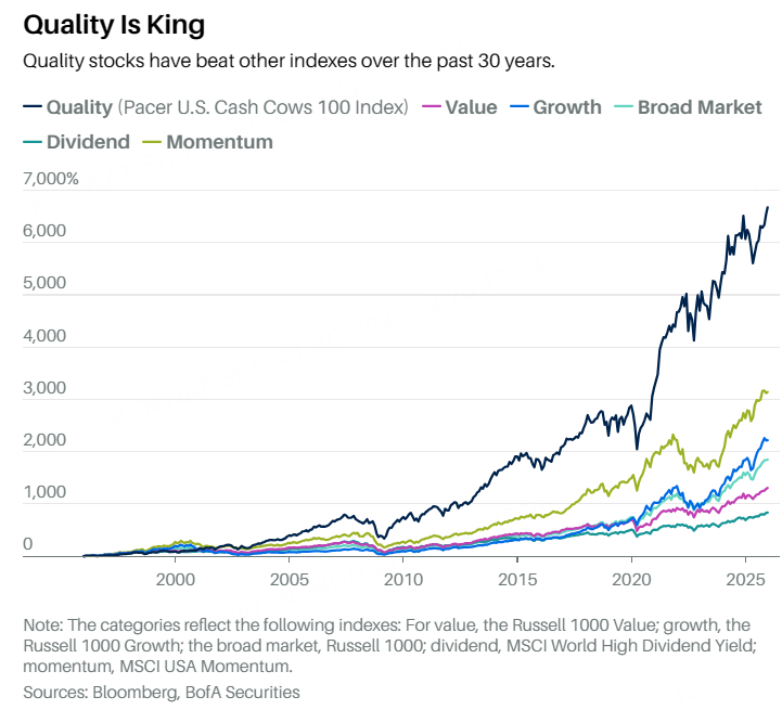 “质量”这个词对任何消费者来说都很有吸引力——无论是在汽车卖场踢轮胎的人,还是在生鲜区闻瓜香的人。对投资者而言,高质量公司意味着财务韧性——这正好可以抵消当下对人工智能支出失控的担忧,或最近一批商业模式不稳健的公司(比如融资囤积加密货币的企业)带来的疑虑。如果瑞银判断正确,即高质量股票在统计上到了该反弹的时候,那就更好了。