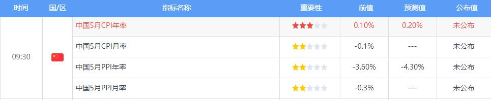 周五,经济数据方面,中国5月CPI年率、PPI年率将出炉。