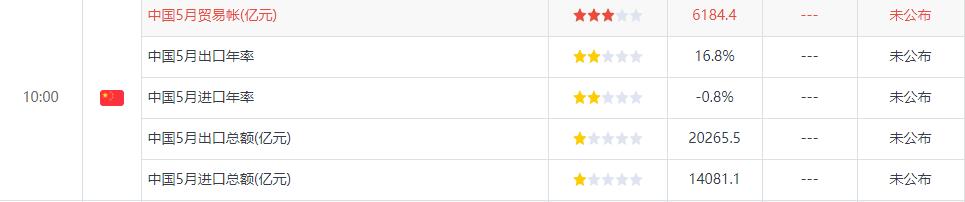 周三,经济数据方面,中国5月贸易帐、中国5月外汇储备、美国4月贸易帐、美国上周EIA原油库存、美国上周API原油库存出炉。