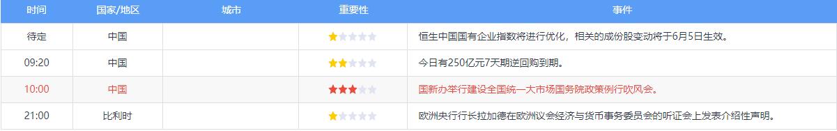 周一,经济数据方面,中国5月财新服务业PMI、美国5月Markit服务业PMI出炉。