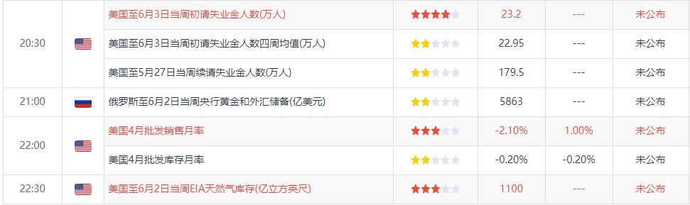 周四,经济数据方面,美国上周初请失业金人数、美国4月批发销售月率将重磅出炉。