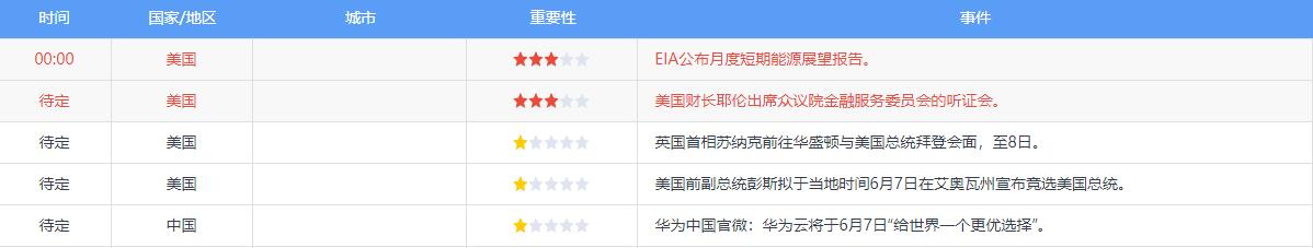 经济数据方面,中国5月财新服务业PMI,美国5月Markit服务业PMI终值,中国5月贸易帐,中国5月外汇储备,美国上周EIA原油库存,美国上周API原油库存,美国4月贸易帐,美国至6月3日当周初请失业金人数,中国5月CPI、PPI将公布。