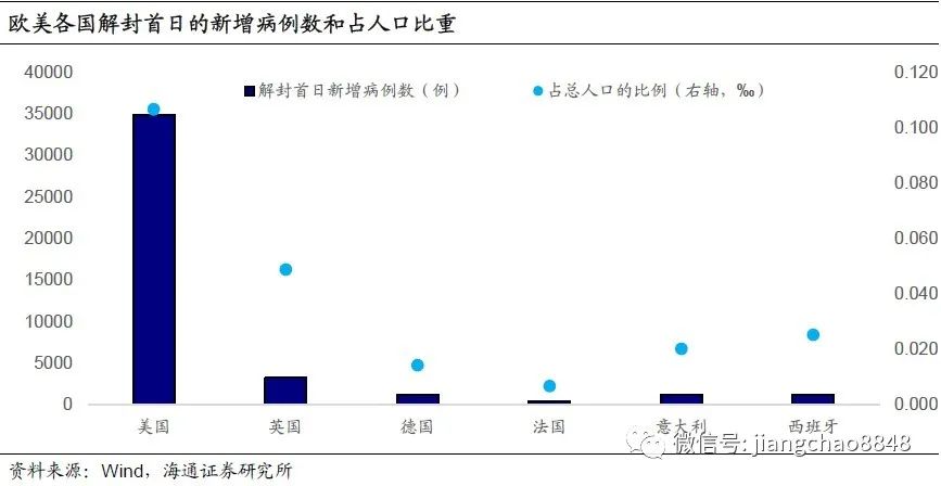 欧洲解封开始实施时,新增病例已大幅下降。解封开始当日,法国的新增病例仅453个,相当于4月初水平的1/10,德国、意大利和西班牙各自也仅新增1000多例,较4月初大幅下降。