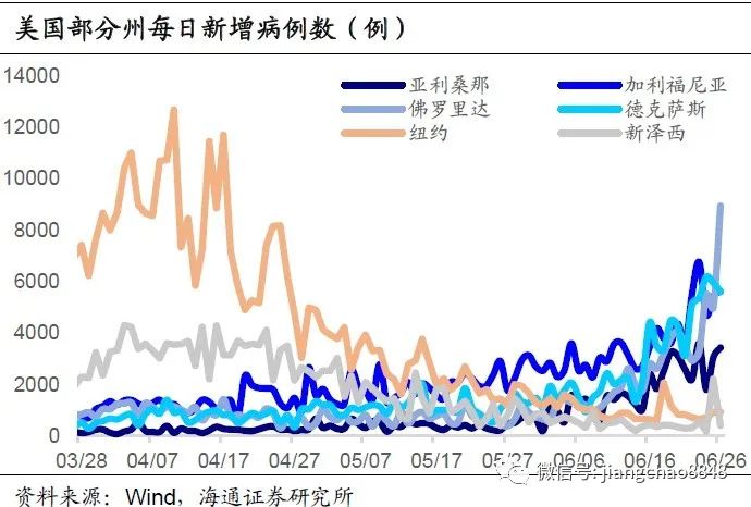 虽然前期疫情严重的纽约州和新泽西州目前新增病例数已大幅回落,但南部的佛罗里达、加利福尼亚、德克萨斯、亚利桑那四个州6月15日以来的日均新增病例数较6月上半月高出1500例以上,6月26日这四个州新增病例分别达8942、5619、5614、3428例,或成为新的“重灾区”。