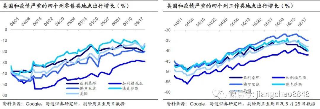 对美国来说,疫情二次抬头的趋势已经出现,复工形势可能出现波折。到6月下旬,美国已有30多个州出现了疫情的反弹,导致美国全国的新增病例创下新高。目前疫情攀升最严重的四个州(德克萨斯、加利福利亚、亚利桑那、佛罗里达)都已宣布暂停进一步重启经济。而根据谷歌的数据,6月中旬以来,这些地区的零售类地点出行回升势头放缓,工作类地点出行甚至重新回落。