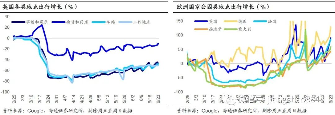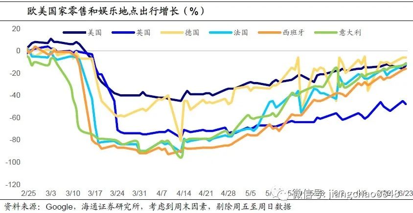 一方面,欧美多国的零售相关出行继续明显回升。根据谷歌的数据,6月以来,美国到零售和娱乐地点的出行人数,较基准情况的跌幅从20%收窄到13%,法国、意大利的零售地点出行数据跌幅都收窄到10%左右,西班牙的跌幅收窄到20%左右,这意味着欧美国家的消费6月或将继续改善。