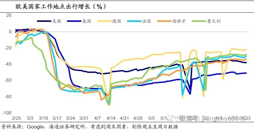 另一方面,虽然6月欧美各国都允许进一步复工,但实际上工作恢复的比例还不高。同样根据谷歌的数据,工作地点的出行人数自4月中旬以来缓慢回升,但也没有因解封开始而出现跳升。到6月23日欧美主要国家工作地点出行情况都还远未正常,即便是疫情得到较好控制的德国、法国、意大利,其工作地点出行人数较基准情形也仍萎缩20-30%,这表明短期生产可能依然偏弱。