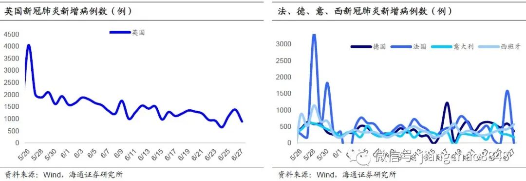 解封近两个月后,目前欧洲疫情尚未出现明显反弹。英国虽然开始解封时新增病例仍高,但其措施整体较为谨慎,启动时间较晚,分步间隔时间较长,最近一个月其新增病例数量从2000以上降至了1000以内。而5月稍早解封的法、德、意、西四国,6月中旬已进入较全面解封的第三阶段,新增病例在6月中下旬较6月初的低位略有抬头,但尚未出现回升趋势,日均新增病例数仍控制在600以内。