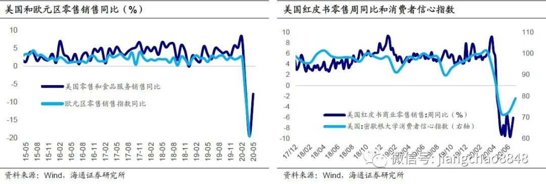 疫情和解封措施成为影响经济的关键,5月解封后,欧美消费明显触底回升。美国和欧元区4月的零售销售同比都下滑了接近20%,从美国已经公布的数据看,逐步解封之后,5月美国零售同比跌幅收窄约一半。而根据6月上中旬的周度零售以及消费者信心指数,消费增速基本触底回升,但尚未回到疫情前的水平。