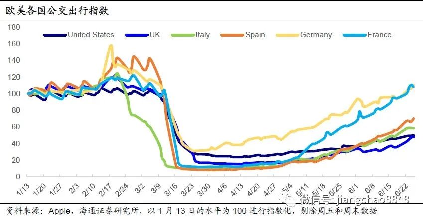 而对欧洲来说,目前疫情相对可控,短期经济继续改善的确定性较强。一方面,欧洲解封政策比美国更为谨慎,当前疫情给复工的约束较小。德、法、意、西四国最近的新增病例数都已降至其总人口的十万分之一以下,都远低于美国万分之一以上的水平。在此基础上,这些国家的公交出行持续提升,代表着更多的社会生产生活重启。截至6月25日,德国和法国的公交出行人数已经高于1月中旬的基准水平,而意大利和西班牙的公交出行也恢复了6成左右。