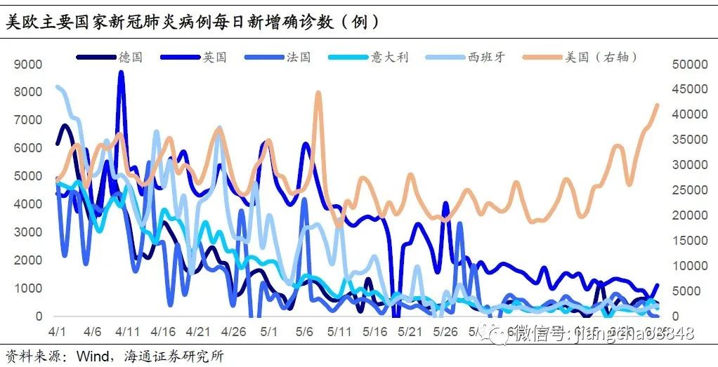 欧美多国新冠疫情蔓延在4月首次见顶。美国每天的新冠肺炎新增病例数5月中旬以后进入平台期,稳定在2-3万例的范围。而欧洲主要国家的疫情扩散趋势也在4月以后明显放缓,5月以来维持在较低水平。德国、法国、意大利、西班牙四国4月的每日新增病例数都在3000例以上,英国则高达5000例左右,但6月前20天,德、法、意、西四国的日均新增病例数降至了500例以内,英国也降至1500例以内。