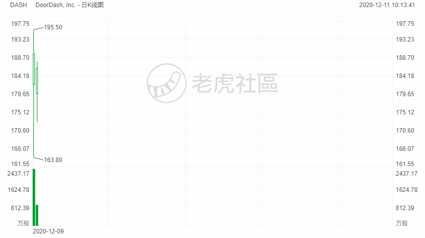 昨晚DoorDash开盘报182美元,较发行价上涨78%,中间虽然略有曲折,仍然震荡走高,截止收盘市值601亿美元,涨幅85%。