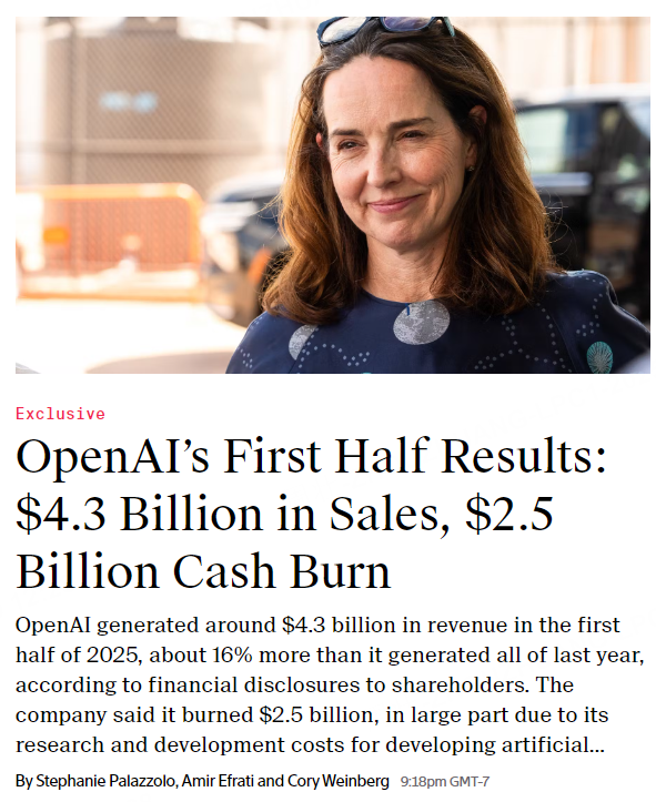 9月30日,据The Information:OpenAI上半年销售额43亿美元,较去年全年收入增长约16%;现金消耗25亿美元,其中很大一部分为开发人工智能和运行ChatGPT的研发成本。