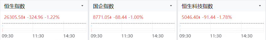 3月2日,港股三大指数低开,恒指跌1.22%,国指跌1%,恒生科技指数跌1.78%。