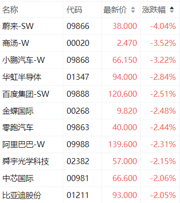 科指成分股中,蔚来-SW跌4.04%,商汤-W跌3.52%,小鹏汽车-W跌3.22%,华虹半导体跌2.84%,百度集团-SW跌2.51%。