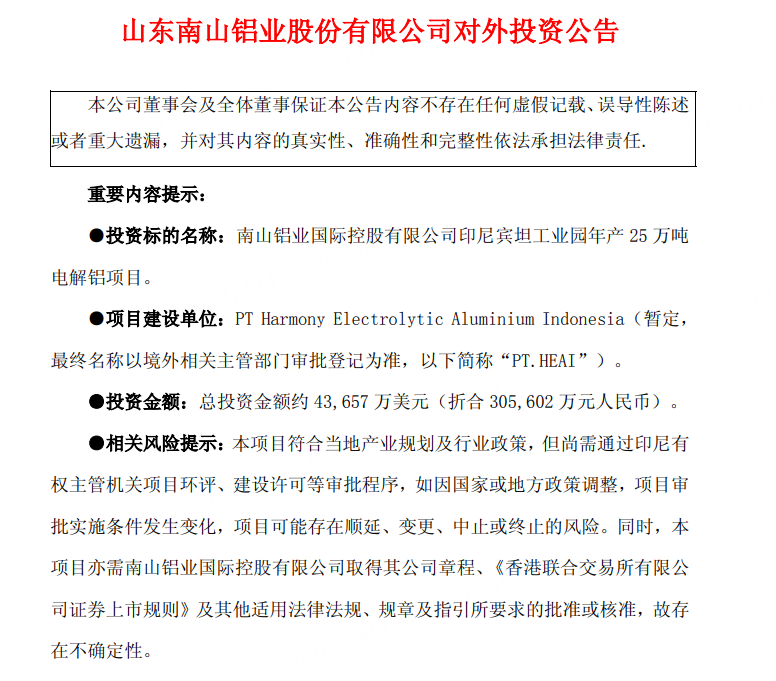 1月19日电,南山铝业公告称,公司拟通过控股子公司南山铝业国际控股有限公司间接全资子公司盛世亚洲与盛世铝业合资,在印尼设立项目子公司PT.HEAI建设南山铝业国际控股有限公司印尼宾坦工业园年产25万吨电解铝项目,投资金额约4.37亿美元(折合30.56亿元人民币)。