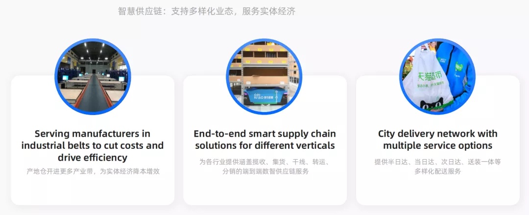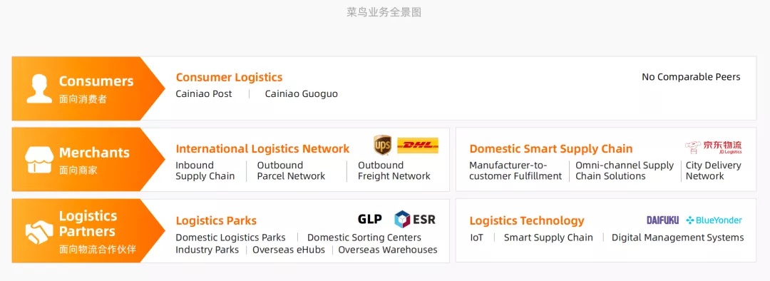 实际上菜鸟更多是面向商家的。在国内它做智能供应链,跟京东物流竞争;在国际上,它的国际物流网络面向的是UPS、DHL等竞争对手,在物流园方面,它面向的是盖普洛斯、ESR等专业物流仓储供应商。