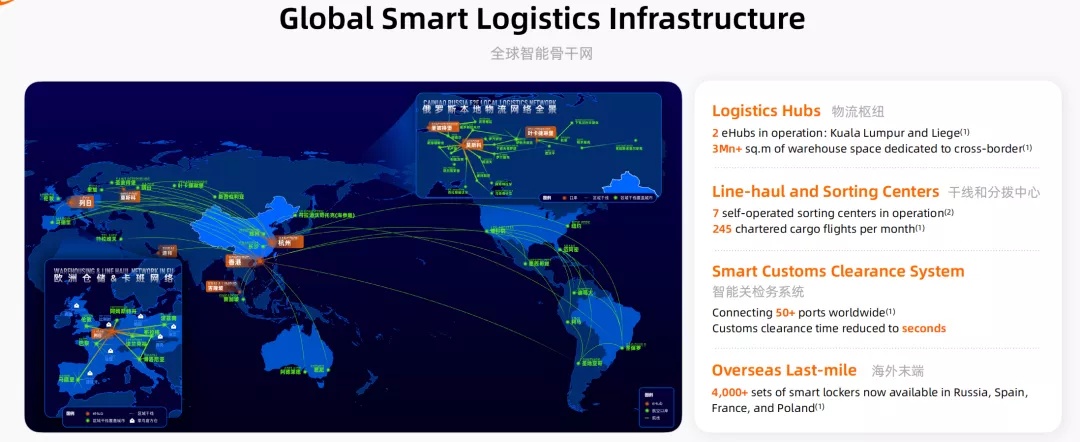 在国际上,菜鸟已经建立了覆盖全球六大重点城市:杭州、香港、吉隆坡、迪拜、莫斯科、列日的智能物流枢纽,并建立了7条自动化处理的干线和分拨中心、智能关检务系统、4000多个智能快递柜。