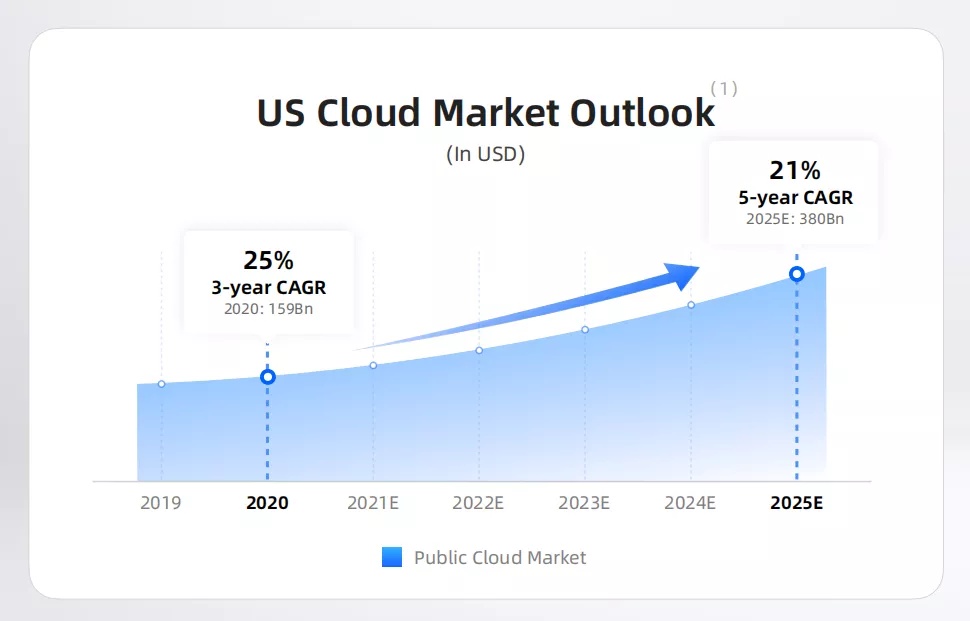 上面两张图是知名数据机构IDC的预测,无论是美国,还是中国,云计算市场未来的复合增长率都将保持高速度。
